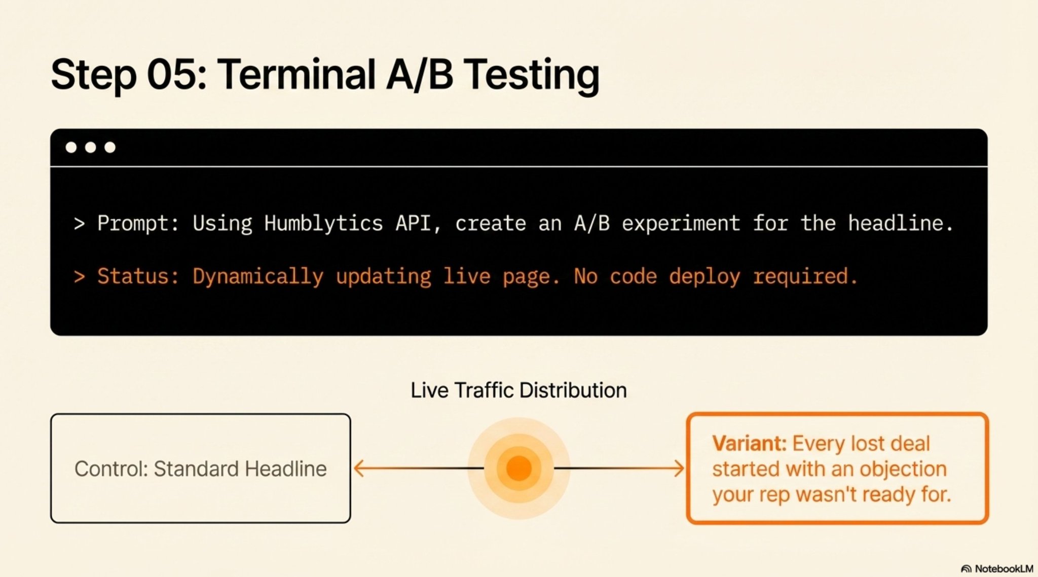 Amir used Claude Code to hit the Humblytics API and create an A/B experiment directly from the terminal. No code deploy. The Humblytics script dynamically updates the page content, so the variant shows up live without pushing changes through a developer.
