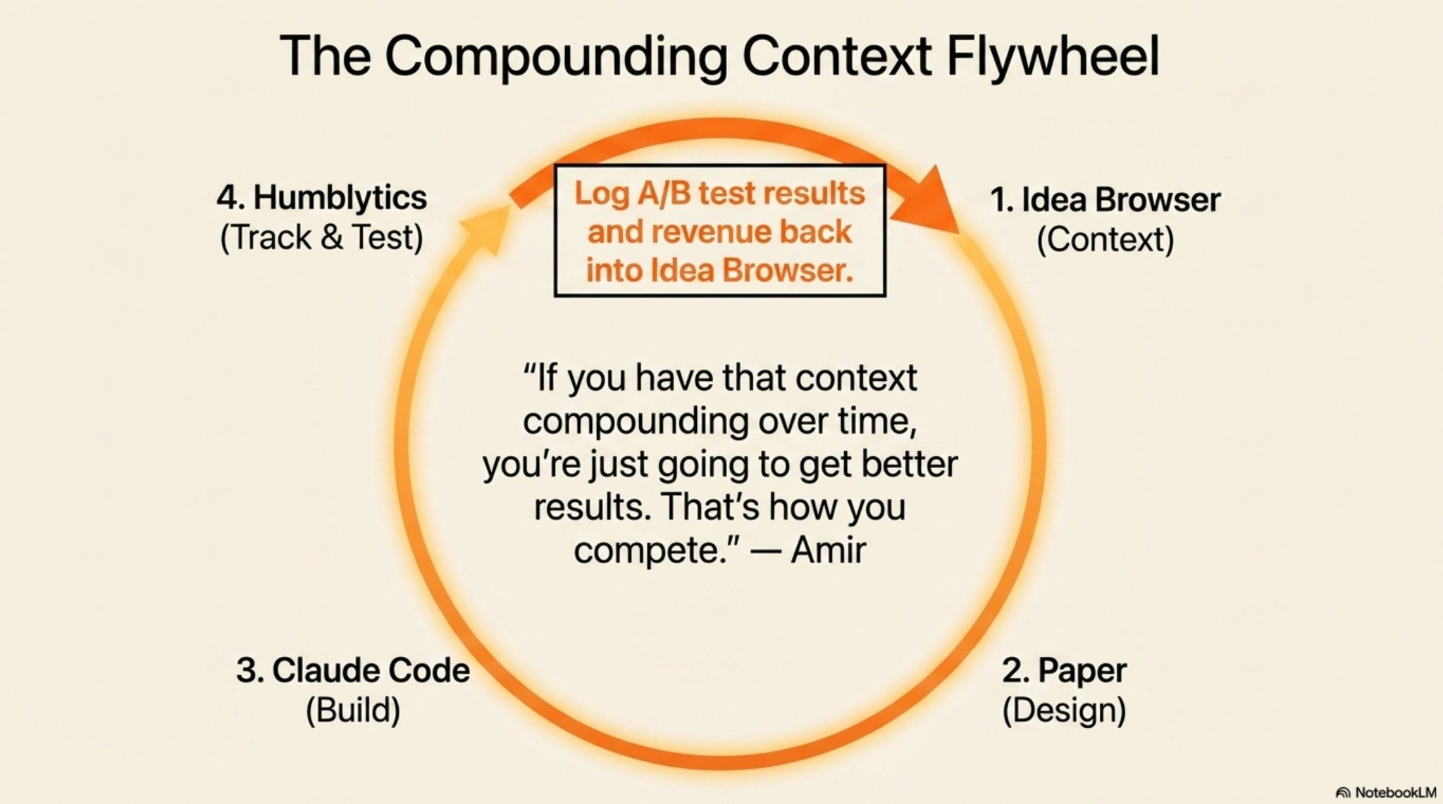 The stack works because each tool feeds the next. Idea Browser holds the context. Paper refines the design. Claude Code builds the page. Humblytics runs the experiment. Postiz distributes the result. And every data point — conversion, click, share, comment — flows back into Idea Browser for the next cycle.