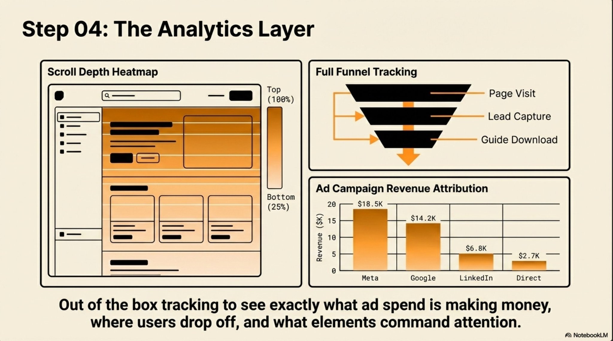 Once the page is live, Humblytics handles the analytics layer. Standard traffic data, channel attribution, heatmaps for scroll depth and click tracking, and full funnel visualization.
