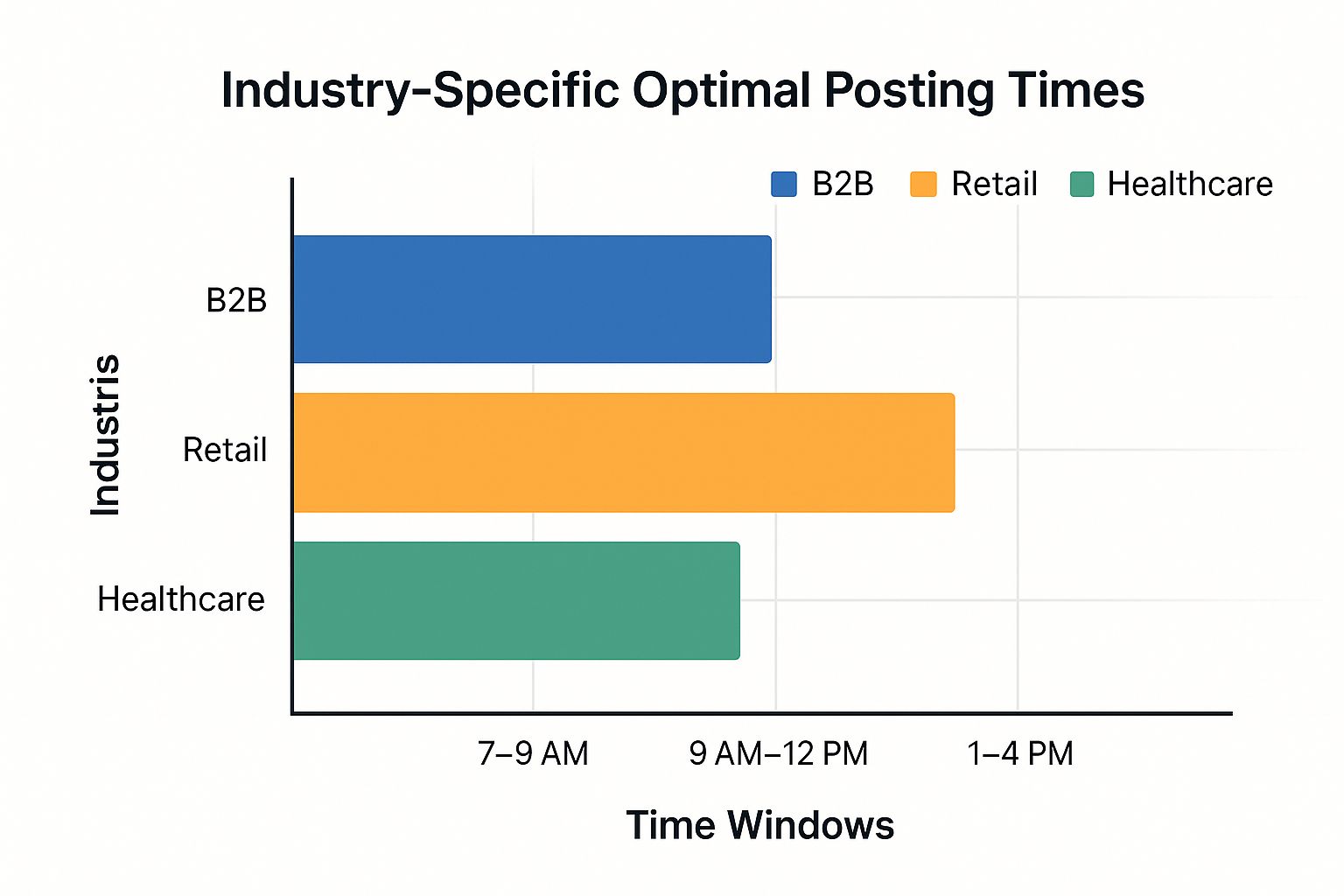 The bar chart below visualizes how optimal posting windows vary dramatically across three distinct sectors: B2B, Retail, and Healthcare.