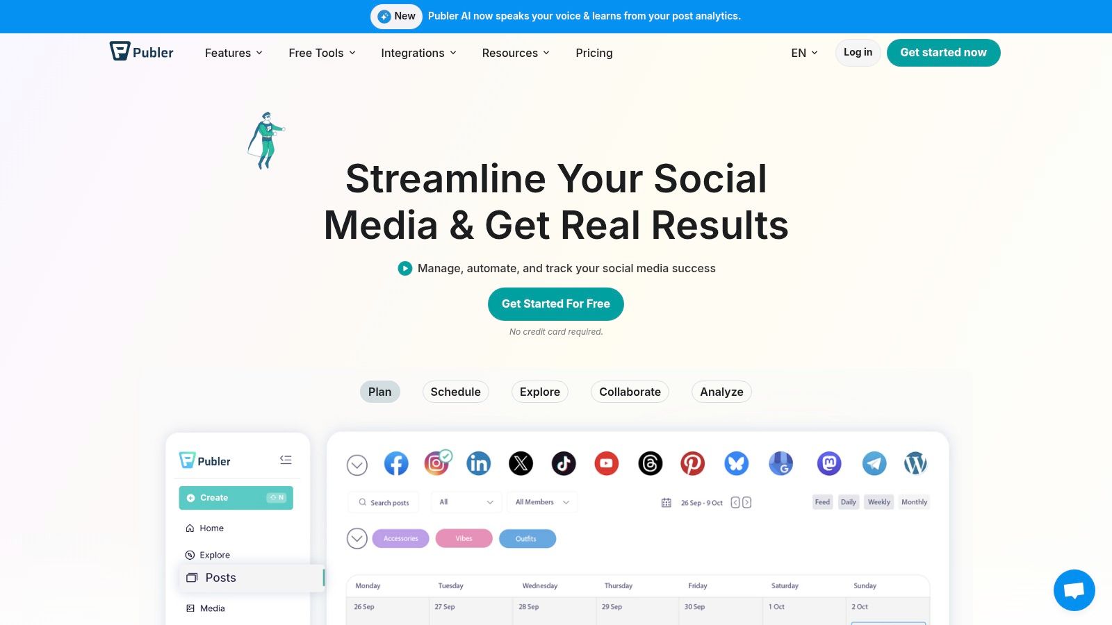 Publer is the best free social media management tool for creators and small businesses who want access to modern creation tools without an upfront cost. Its generous feature set, including the Canva integration and AI assistant, makes it ideal for those focused on producing visually appealing content efficiently.