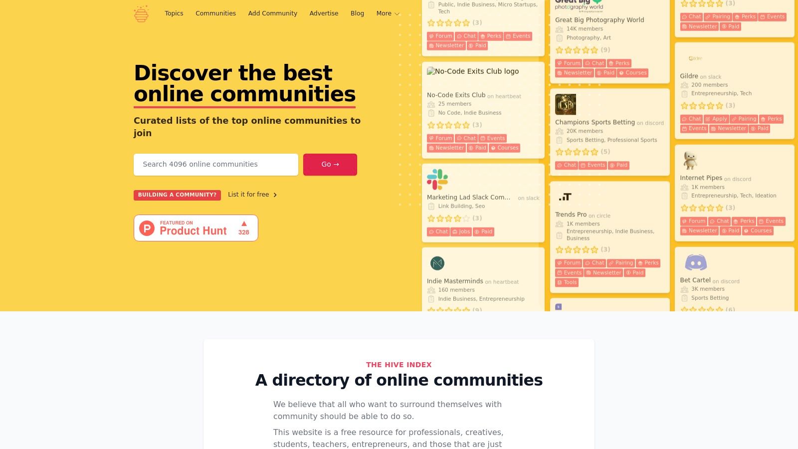 While our focus is on finding the best subreddits for startup marketing, The Hive Index offers a broader, platform-agnostic perspective that is invaluable. It’s a comprehensive directory of over 4,000 online communities, not just on Reddit but also on Slack, Discord, and other platforms. This makes it an excellent tool for founders who want to discover adjacent communities and build a multi-channel community engagement strategy from a single dashboard.