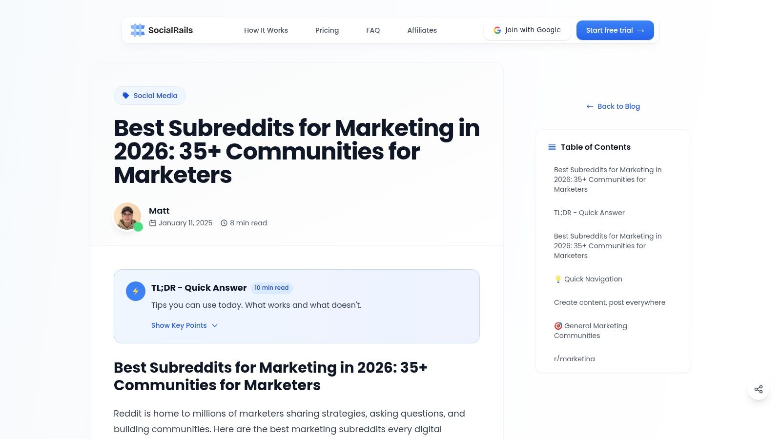 Next on our list is SocialRails' comprehensive roundup of marketing and social media subreddits. While not a dynamic tool, this curated blog post serves a similar purpose to a directory by gathering over 35 relevant communities into one scannable list. It’s an ideal resource for marketers who want a goal-oriented overview, helping them quickly map subreddits to specific objectives like PPC research, content promotion, or social media trendspotting.