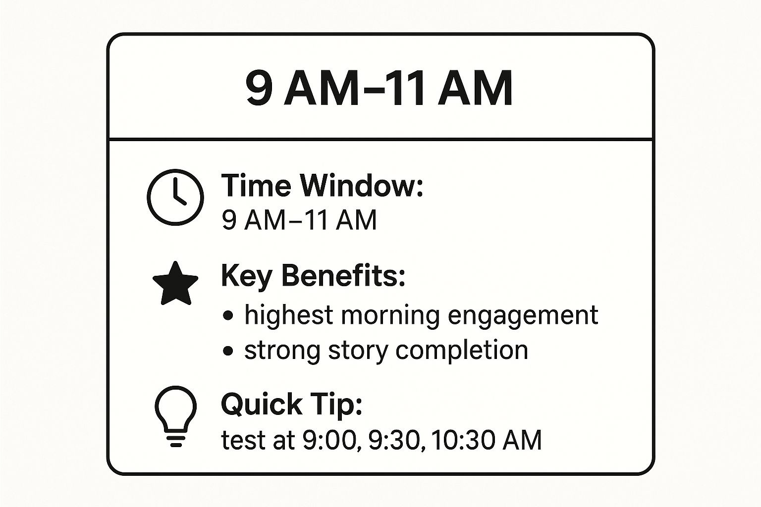 Post During Peak Engagement Hours (9 AM – 11 AM) | Low – schedule posts based on general time window | Moderate – content suited for morning motivation | High visibility and strong story completion rates | Professional audiences, B2B, lifestyle, educational | Front-feed visibility, lower competition, good interaction |