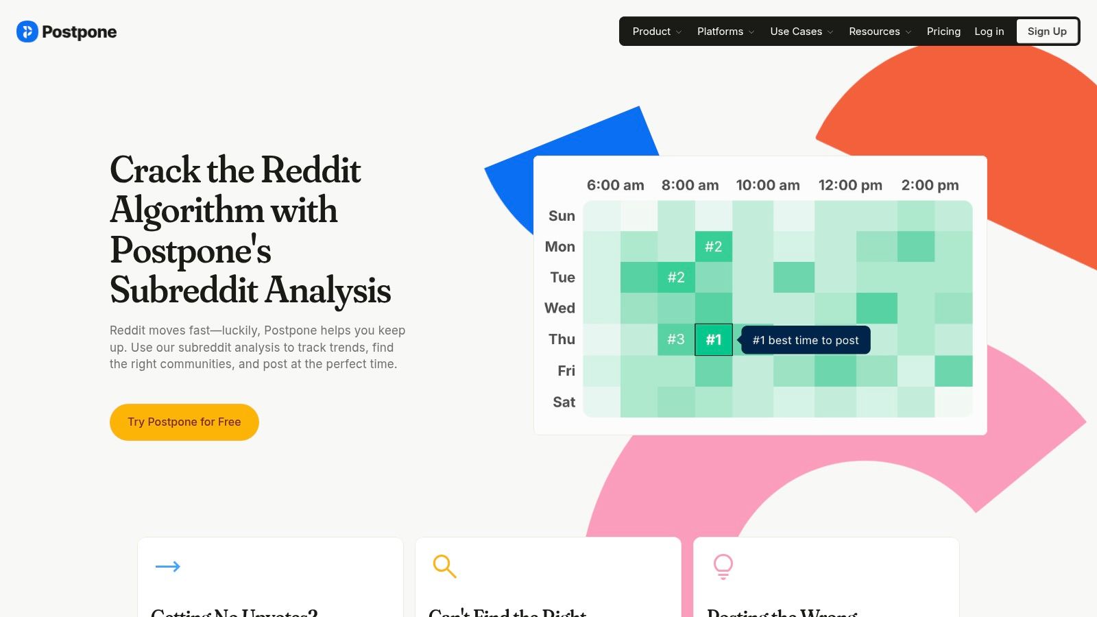 Postpone is built for active Reddit users, from individual creators to marketing agencies, who need a reliable tool to manage their content calendar and optimize performance. Its feature set is focused on simplifying and automating the entire Reddit posting process.
