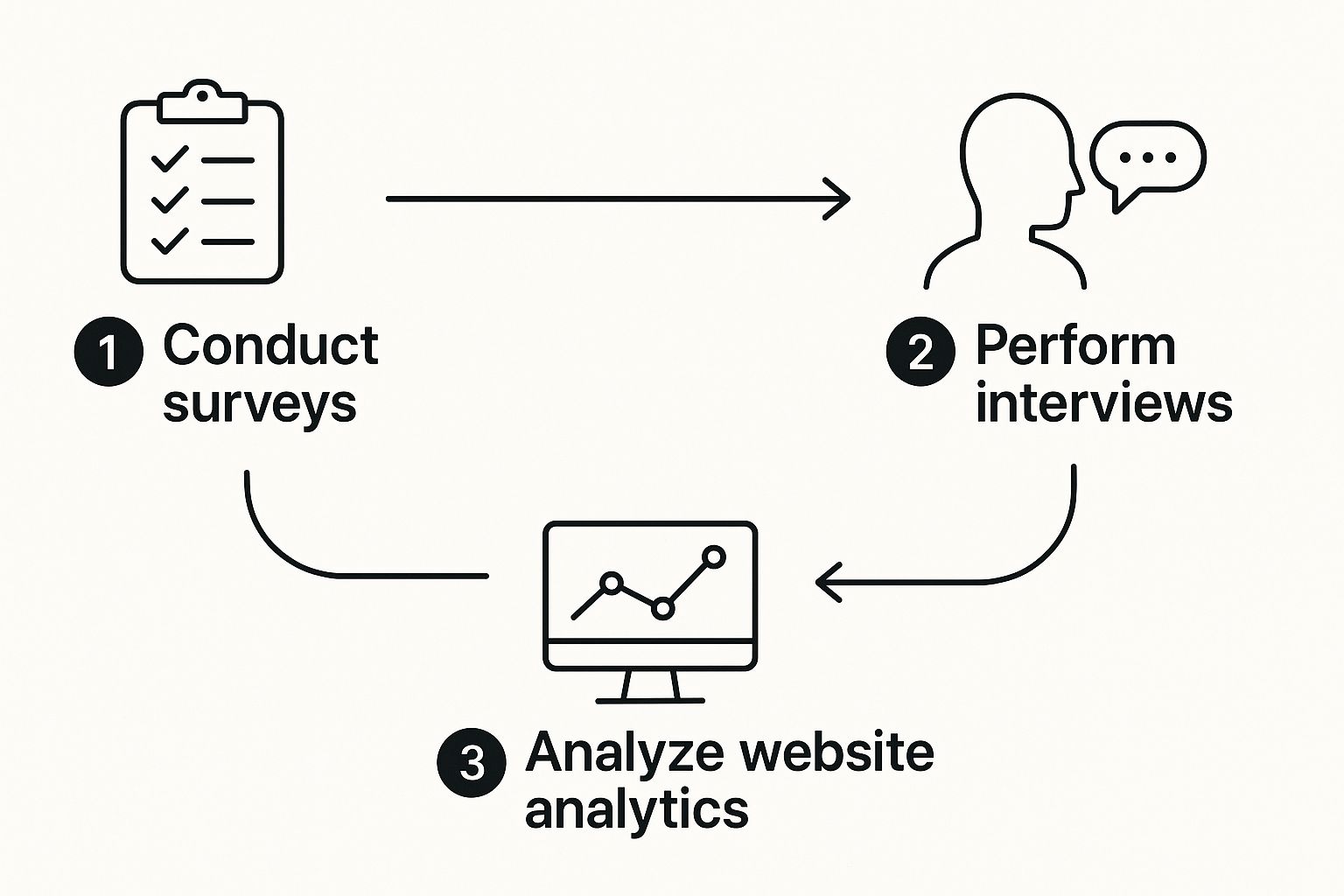 This simple workflow is a great reminder of how different data sources work together. Surveys can give you broad, statistical insights, while direct interviews provide the deep, personal context you can't get anywhere else. Analytics then help you validate those behaviors at scale.