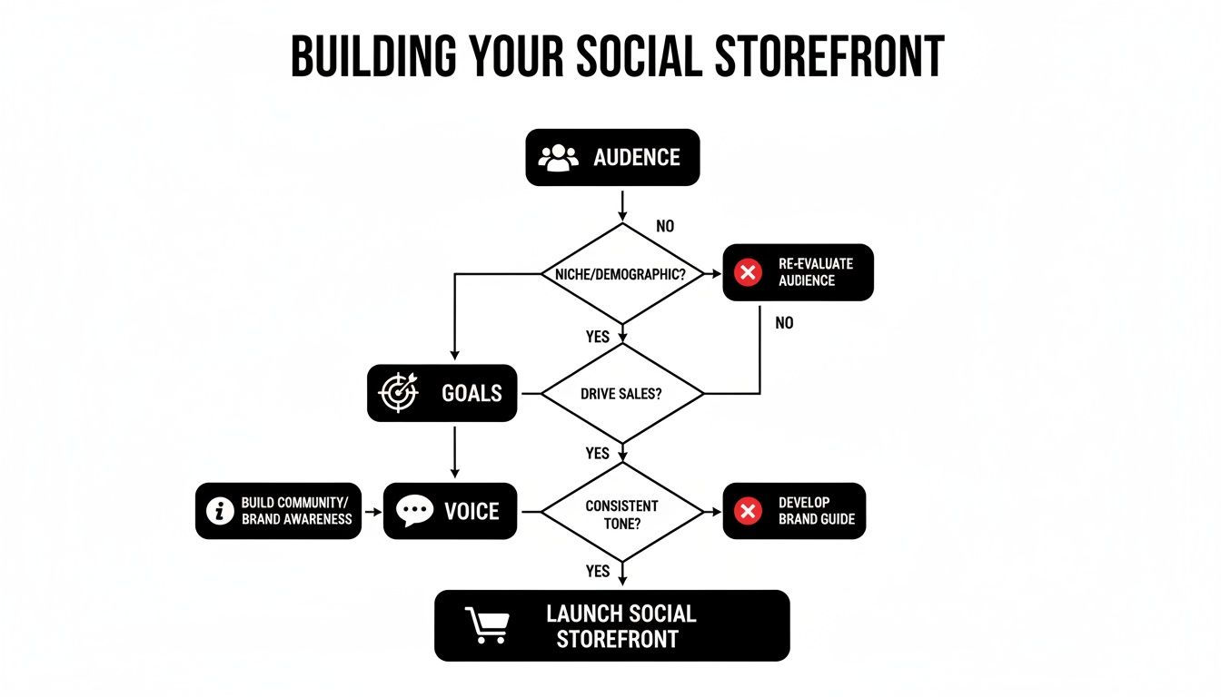 As the flowchart shows, building a social storefront that actually sells starts with a deep dive into who you're selling to. Once you know that, everything else—from your goals to your tone—falls into place.