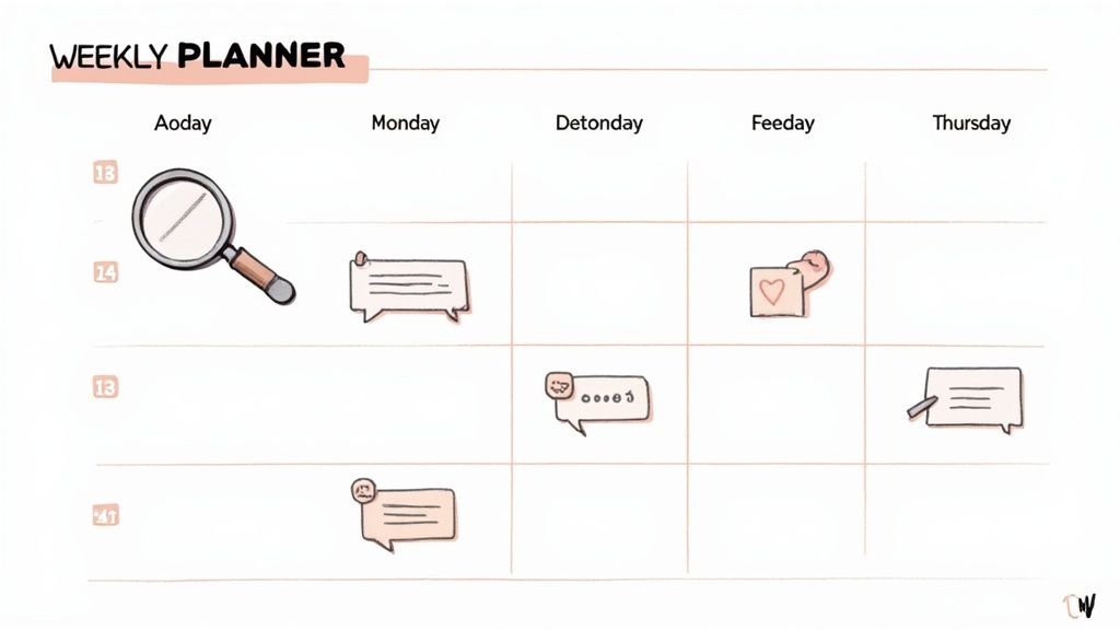 This isn't just a to-do list; it's a strategy. By giving each day a specific focus, you turn engagement from a random act into a deliberate, repeatable process. You're guaranteeing a healthy mix of content creation, community building, and analysis.
